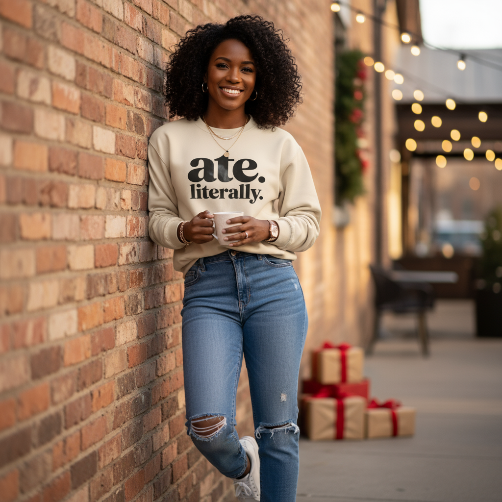 “Ate. Literally.” is the ultimate Friendsgiving/Thanksgiving baddie flex. Cute, quick, clever—and just the right amount of petty—this design is made for the woman who brings the vibes, the outfit, AND the seasoning.