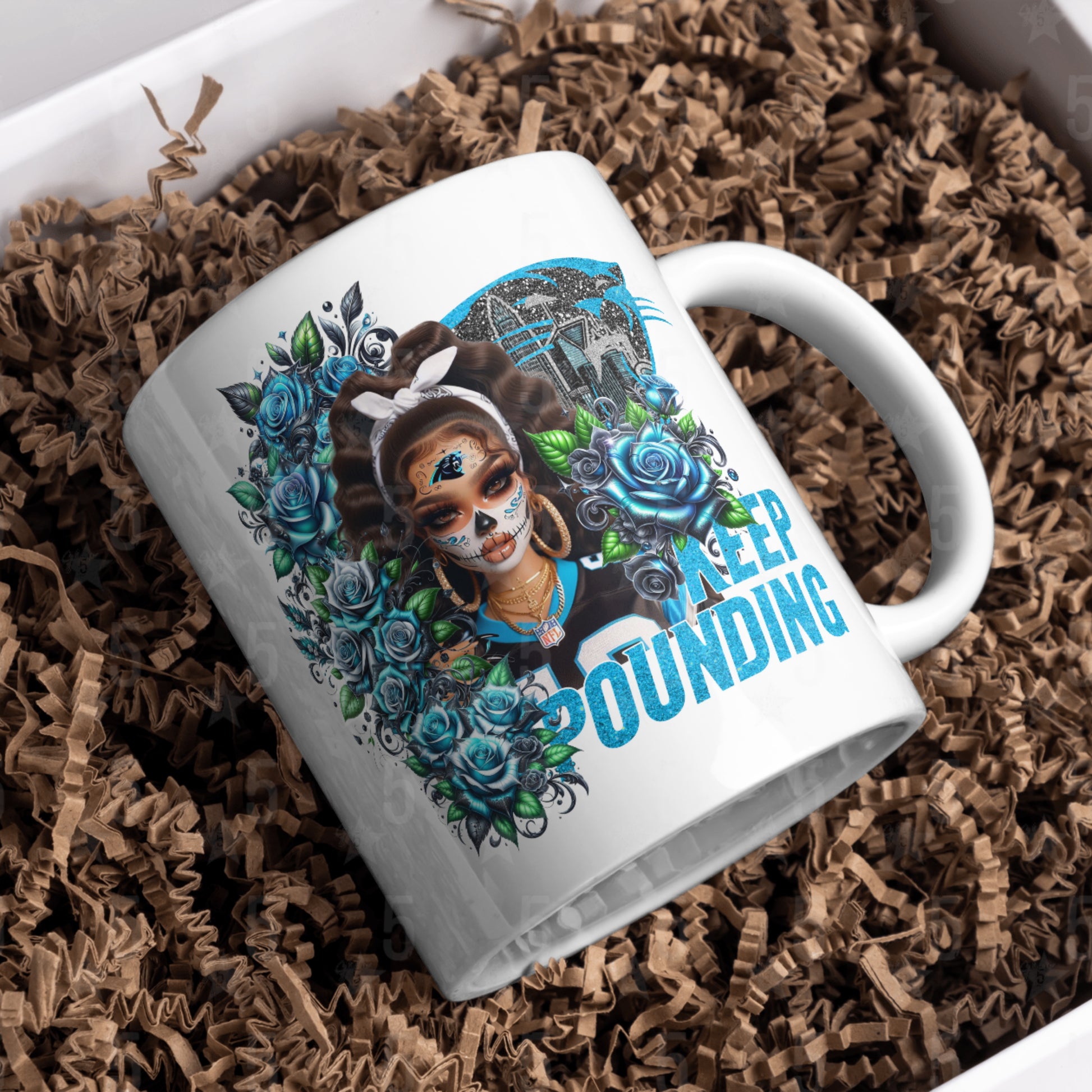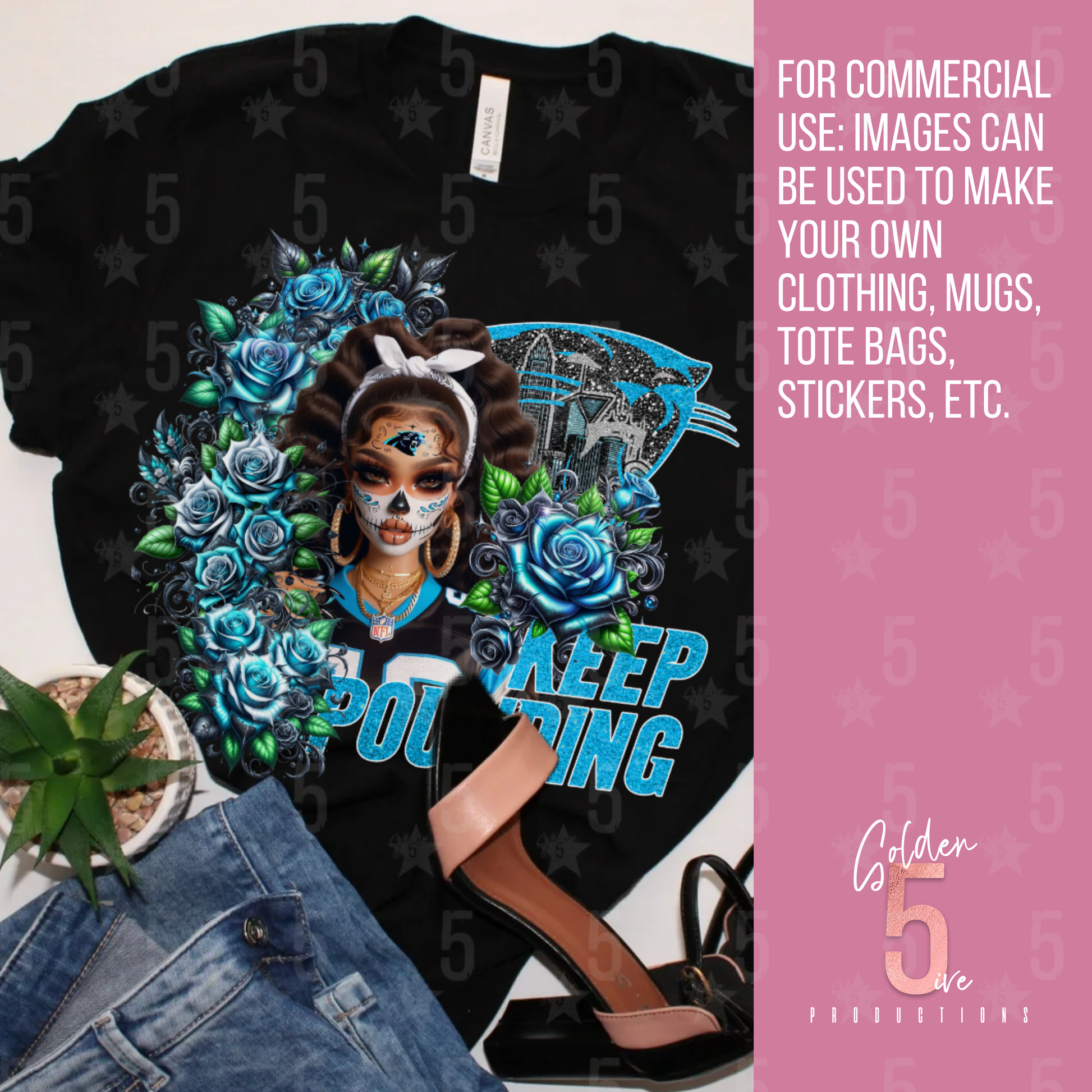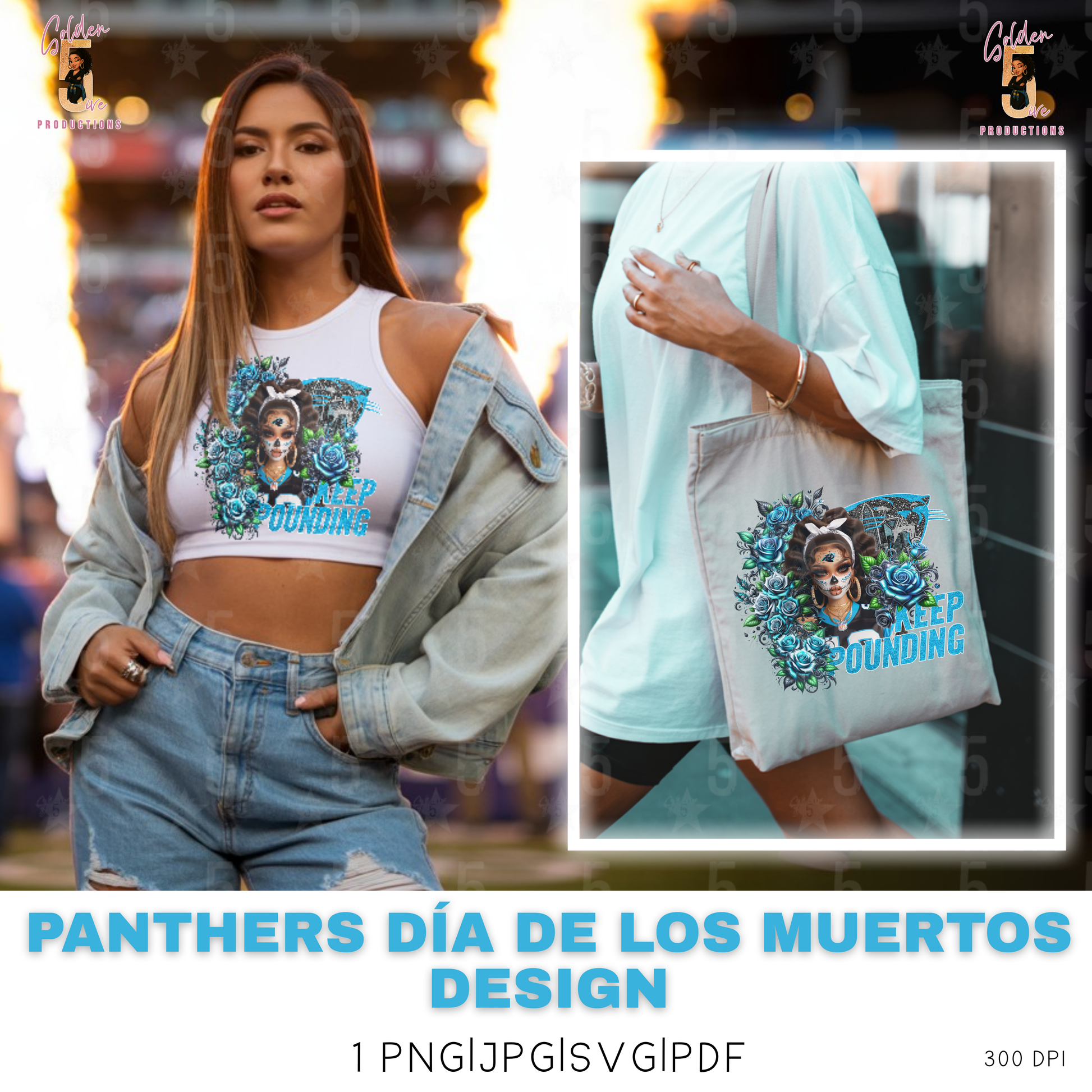 Keep Pounding! Celebrate your love for Panthers football, culture, and fashion with this unique Día de los Muertos–inspired design. This bold artwork blends NFL fan pride with traditional Day of the Dead sugar skull aesthetics, creating the perfect design for game day, tailgates, or year-round style.