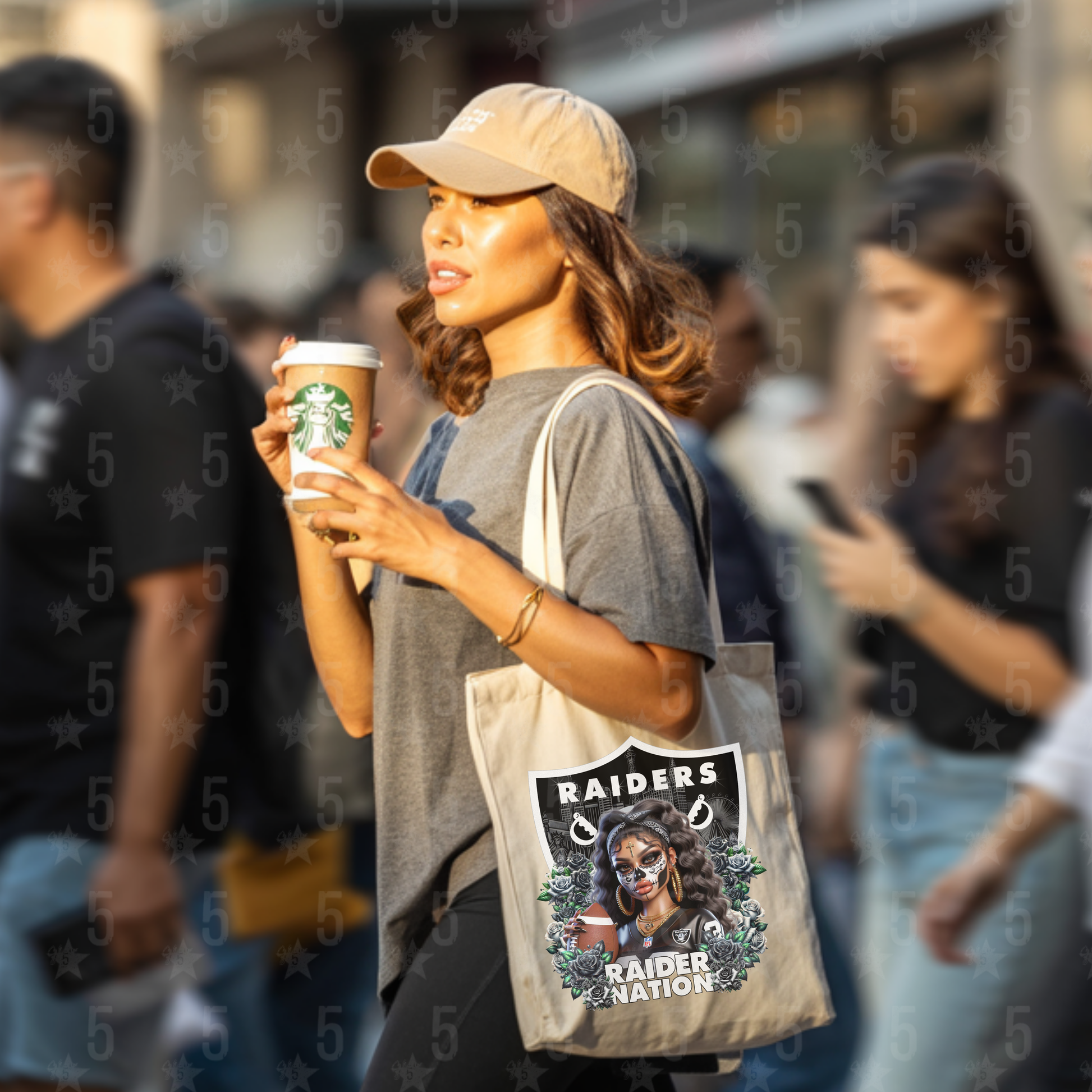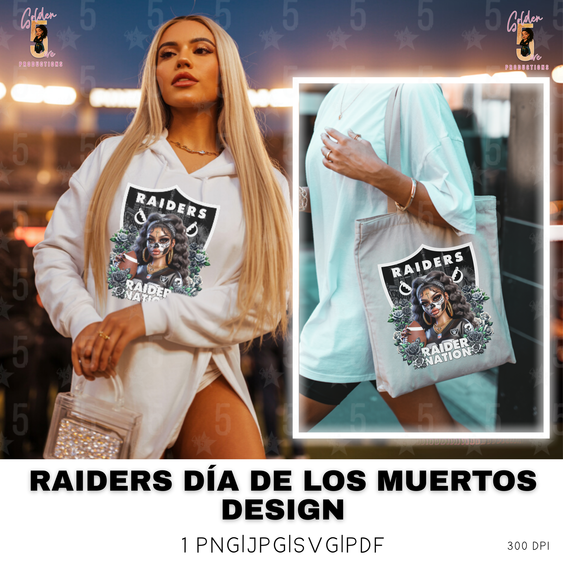 Raider Nation, celebrate your love for Raiders football, culture, and fashion with this unique Día de los Muertos–inspired design. This bold artwork blends NFL fan pride with traditional Day of the Dead sugar skull aesthetics, creating the perfect design for game day, tailgates, or year-round style.