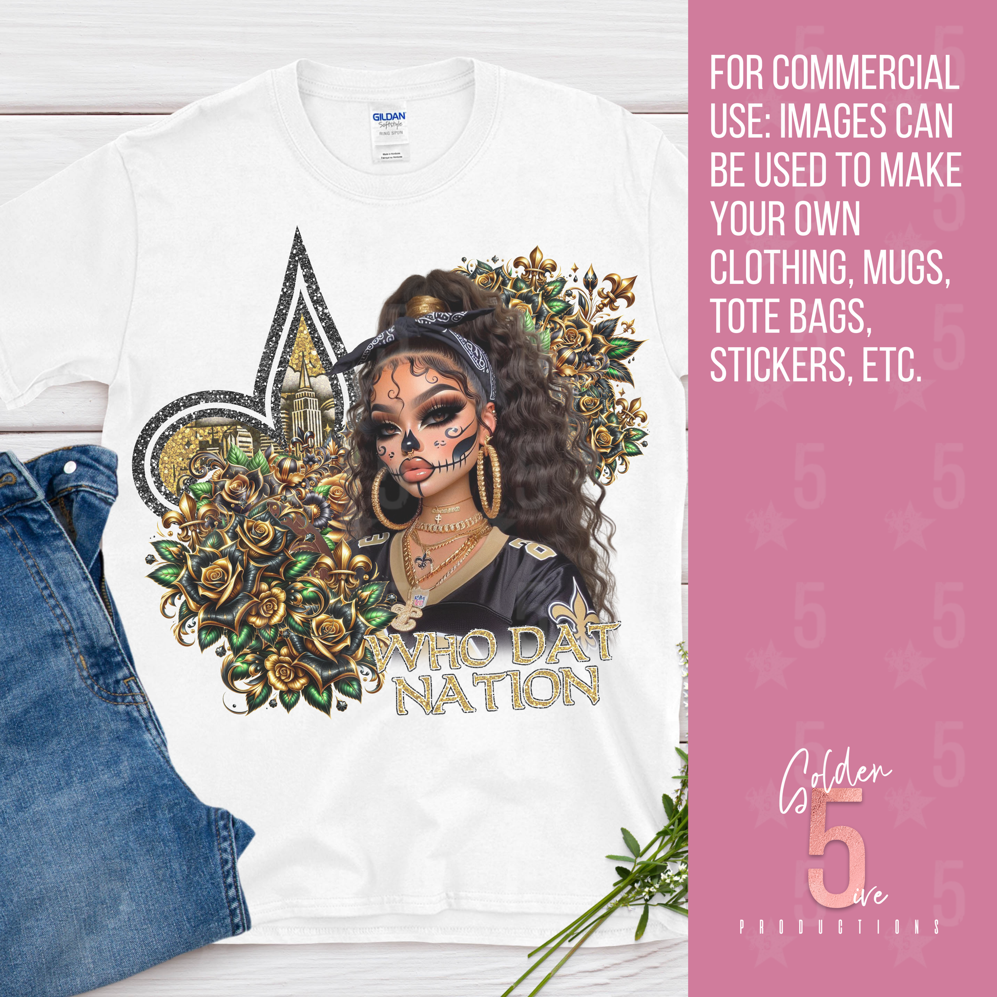 Who Dat Nation! Celebrate your love for Saints football, culture, and fashion with this unique Día de los Muertos–inspired design. This bold artwork blends NFL fan pride with traditional Day of the Dead sugar skull aesthetics, creating the perfect design for game day, tailgates, or year-round style.