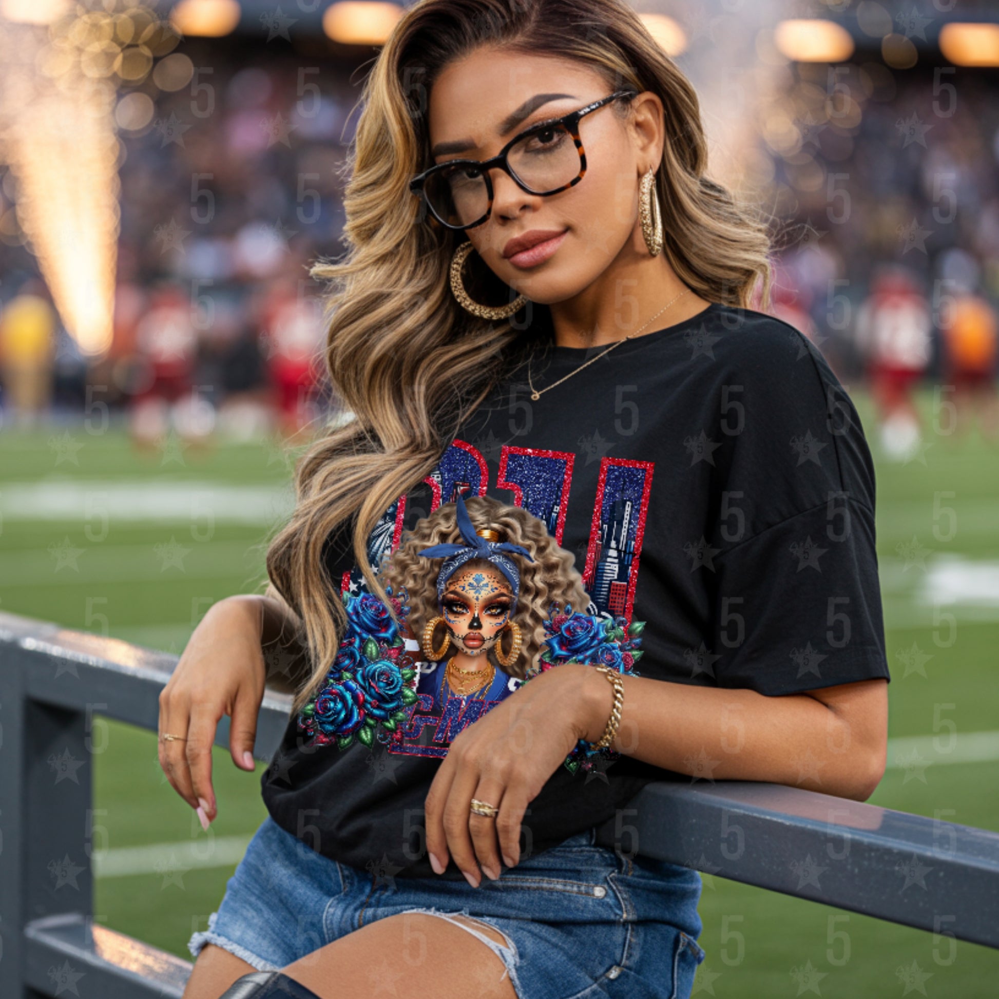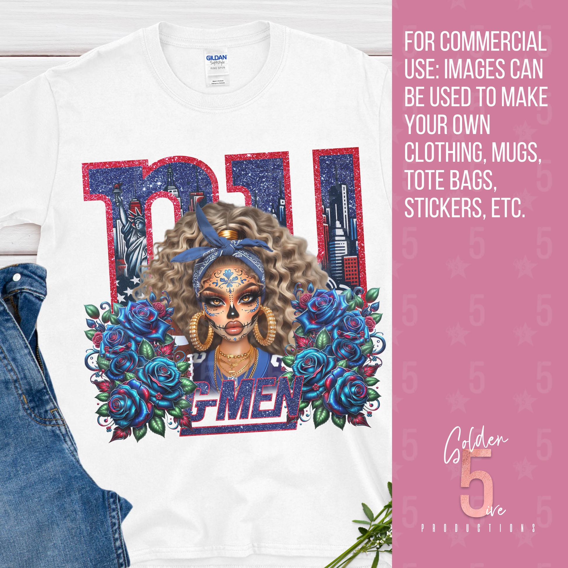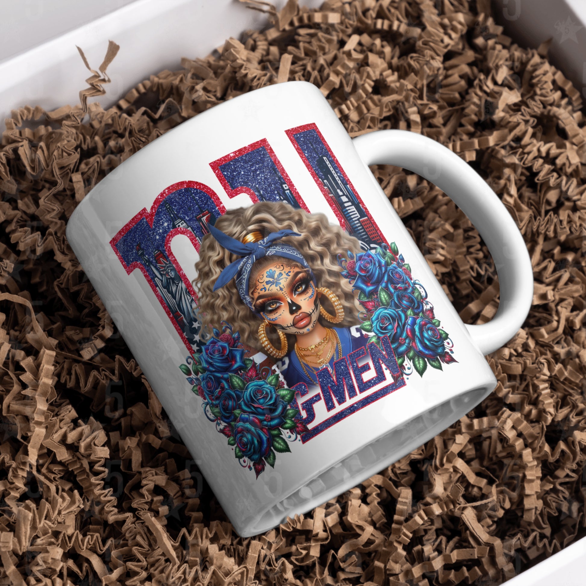 Celebrate your love for G-Men football, culture, and fashion with this unique Día de los Muertos–inspired design. This bold artwork blends NFL fan pride with traditional Day of the Dead sugar skull aesthetics, creating the perfect design for game day, tailgates, or year-round style.