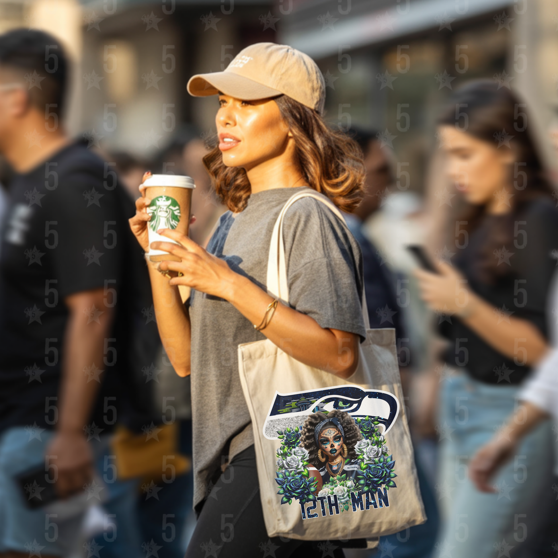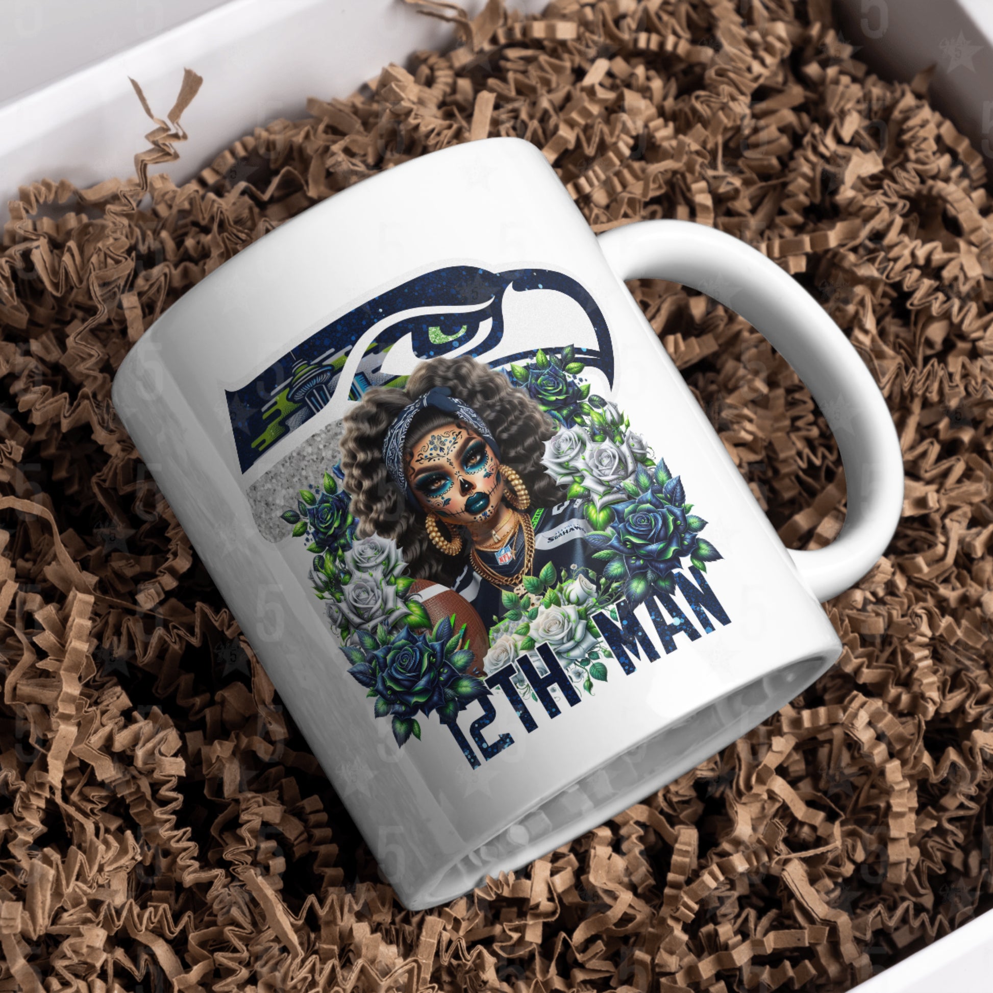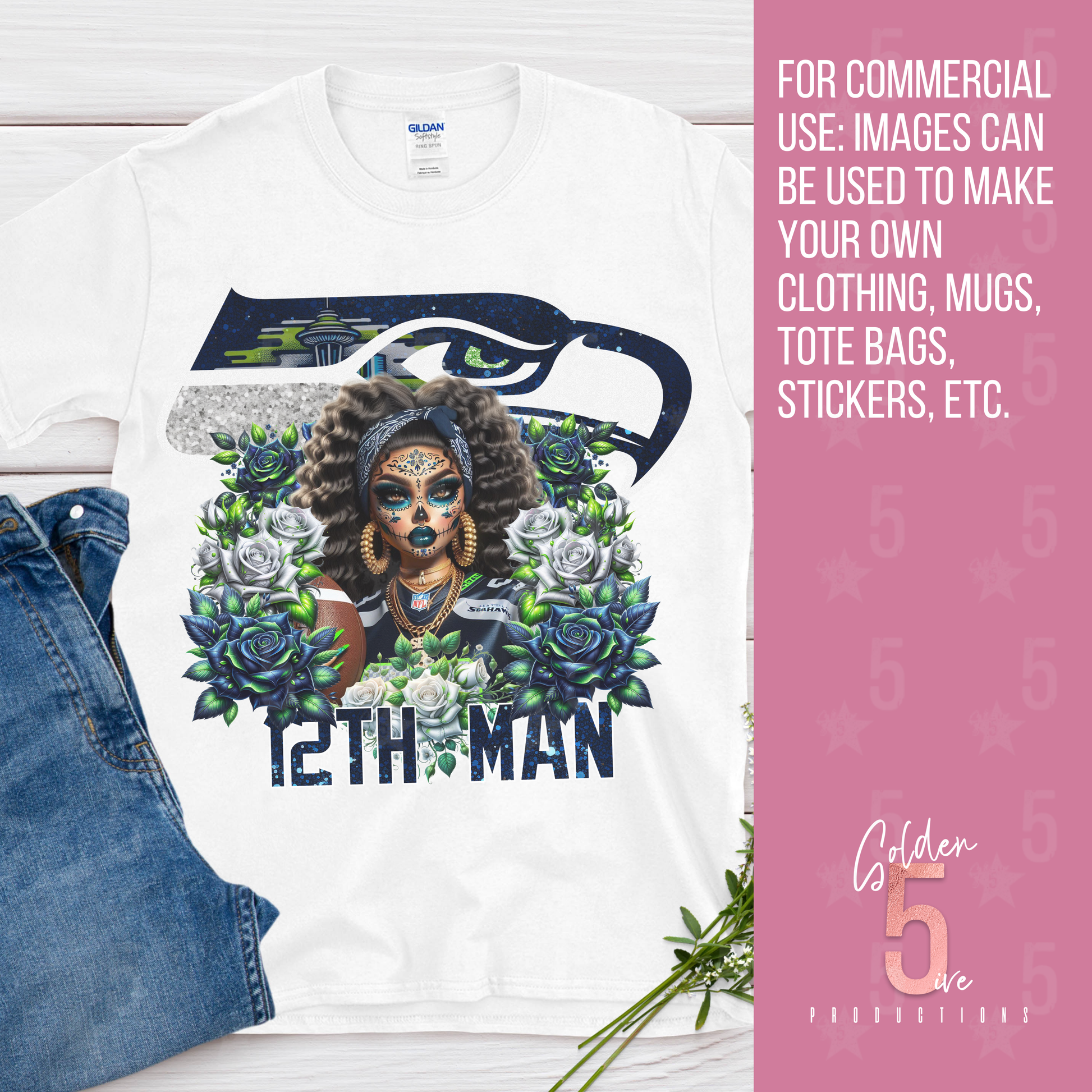 12th Man! Celebrate your love for Seahawks football, culture, and fashion with this unique Día de los Muertos–inspired design. This bold artwork blends NFL fan pride with traditional Day of the Dead sugar skull aesthetics, creating the perfect design for game day, tailgates, or year-round style.